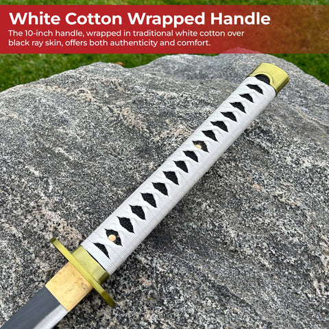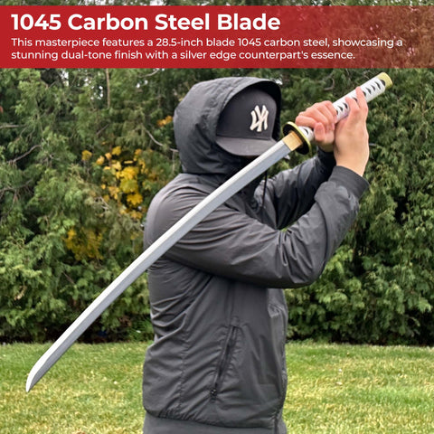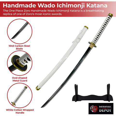 Embrace the spirit of the legendary swordsman with the One Piece Zoro Handmade Wado Ichimonji Katana, a stunning replica of Zoro’s iconic white-bladed sword from One Piece. Handcrafted to perfection, the 28.5 inch 1045 carbon steel blade is polished to a pristine finish, reflecting the Wado Ichimonji’s elegant and refined design. The oval-shaped metal guard, finished in gold, mirrors the sword’s distinctive appearance from the series. The 10 inch handle is expertly wrapped in white cotton with gold accents, ensuring both authenticity and a comfortable grip. The katana is completed with a hard white scabbard, accented with matching gold fittings, creating a visually striking piece worthy of any collector's display. Measuring 41.5 inches overall, this handcrafted replica perfectly balances artistry and functionality. The Wado Ichimonji Katana also includes a protective black cotton storage bag and a desktop display stand, making it a must-have for collectors and fans alike.