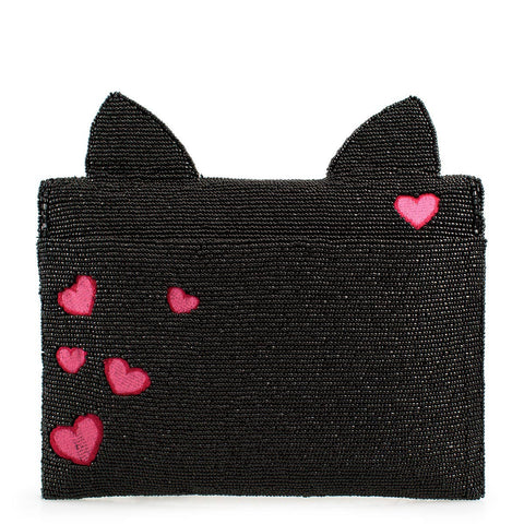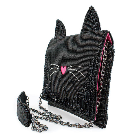Unleash your inner feline with this beaded black cat crossbody clutch with 3D ears. Adorned with large sparkling gems and an embroidered "meow" under the flap, this handbag adds a touch of whimsy to any outfit. Meow-ve over boring purses, this one has elevated style! Purse dimensions: 9.5 x 1.5 x 6.75". Strap length end to end: 50". Strap drop: 21.75"