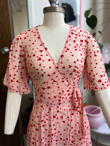 Lydia Wrap Dress in Pink Queen of Hearts flocked mesh