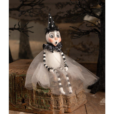Add a touch of spooky fun to your Halloween decor with the Party Ghost Sitter by LeeAnn Kress! This adorable ghost, complete with a festive party hat, features dangle arms and legs that you can position to sit perfectly on a shelf or a stack of books. Dressed in a long gauze overlay and sporting a surprised O-shaped mouth, this ghost is full of charm and ready to liven up your Halloween display. A whimsical addition to any spooky setup!