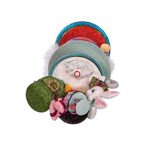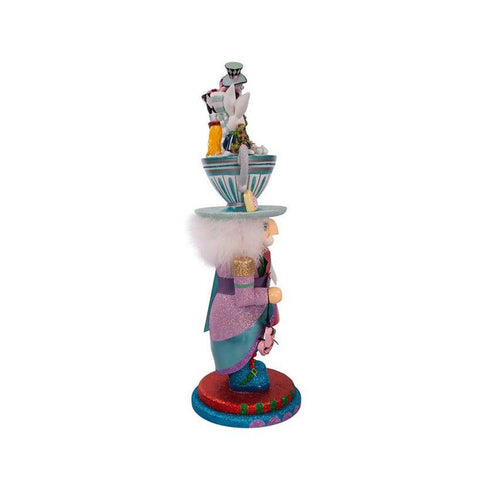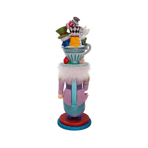Hollywood Nutcrackers™ is a whimsical collection of nutcrackers created exclusively for Kurt S. Adler, Inc. and features an assortment of designs that put a unique, vibrant, memorable twist on traditional nutcrackers. This 24-inch Alice Teacup Party Hat Nutcracker is a fun and festive addition to any home or office holiday décor. Dressed in a multicolor glittered outfit, this nutcracker is holding a double heart ornament in one hand, his teacup hat holds Alice and her friends with a tea set and a glittered saucer. He is standing on a matching red, green, blue and purple glittered base.