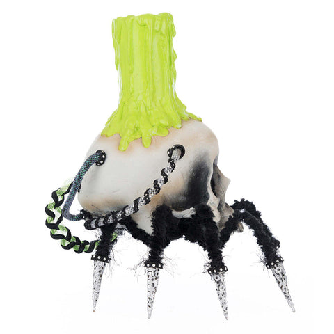 The Chaotic Spider Skull Candle Holder is a strikingly eerie centerpiece that blends Gothic elegance with Halloween charm. Measuring 10 × 9.5 × 12 inches, this handcrafted masterpiece from Katherine's Collection showcases a skull entwined with intricate spider web details, creating a hauntingly beautiful display. Designed to hold a candle, the flickering light casts shadows that amplify its spooky appeal, making it the perfect addition to your mantel, dining table, or haunted vignette. Both artistic and functional, this piece is a testament to superior craftsmanship, offering a bold statement for your Halloween decor collection.