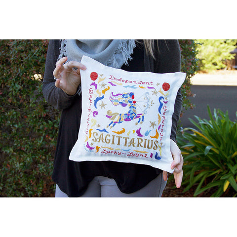 This pillow is entirely EMBROIDERED by HAND on 100% Fine Linen with vibrant colors plus traditional silver and gold Zari thread. Amazingly,it can take 8+ hours to embroider one pillow! It is also unique in nature since each artisan incorporates a certain flair to their work, and every piece is signed on the tag. Created on cream linen background, accented with flange, and finished with a zipper closure. Each pillow even has a constellation and astrological date detail printed on the back. 12x12 inches.