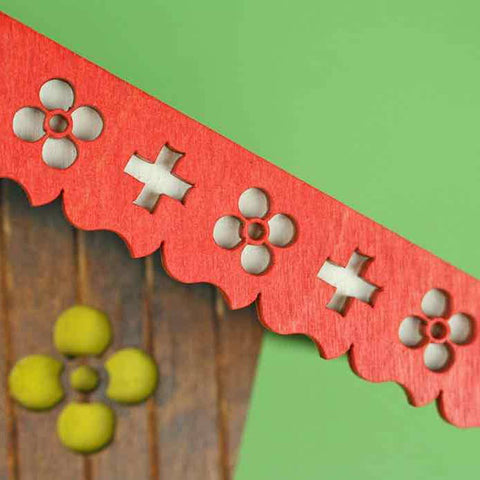 The original swiss chalet cuckoo clock. Hand made. Loetscher's "Woodcutter’s Chalet" model distinguishes itself from the others with its brightly painted red-colored eaves and gables decorated with yellow-colored flower carvings. When music plays at the half hour, the waterwheel rotates and the seesaw swings up and down. Never a dull moment at the "Woodcutter's Chalet"!