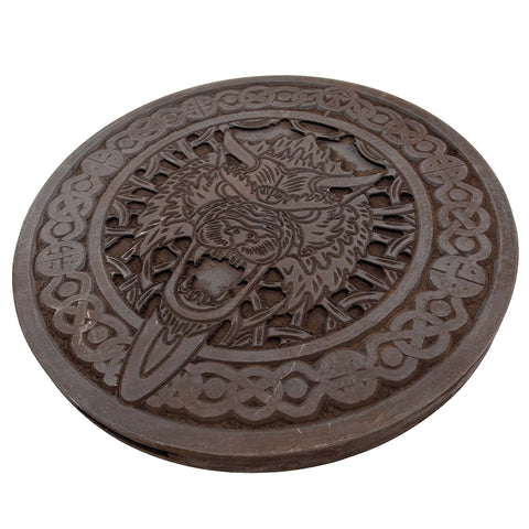 Showcase your sword in striking style with this wooden vertical display plaque. Expertly carved, the front features a fierce wolf’s face surrounded by an intricate runic pattern, blending artistry with function. Mount the plaque to your wall and slide your sword into the top for a bold, space-saving display that transforms any room. Designed to hold swords with blades up to 2 inches wide, the plaque measures 11 inches in diameter, making it a standout piece for collectors and enthusiasts alike.