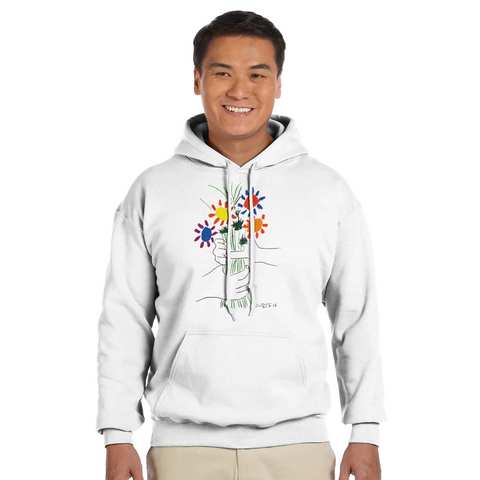 This cozy hoodie showcases one of Picasso’s most celebrated works, the *Bouquet of Peace*. Also known as *Hands with Flowers* or *Hands with Bouquet*, it was created in 1958 to honor a peace demonstration in Stockholm. A timeless symbol of harmony, captured in Picasso’s unmistakable style.