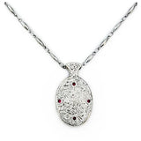A unique Sterling Silver pendant representing elements of the original, world famous vampire story, Bram Stoker's Dracula. The eye on the bail represents Dracula's supernatural vision and his ability to see Mina wherever she may go. The four small blood red stones, the four corners of Dracula's dominion. The central stone (lab-grown star ruby) represents Mina's immortal soul and flame of life; or (black onyx) the count's eternal darkness.