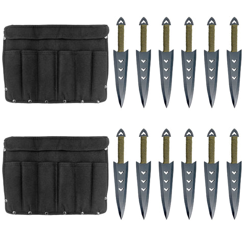 12-Piece Complete Set: Includes twelve balanced throwing knives and two nylon pouchesDurable metal construction: Made from solid metal with a black finish for lasting use