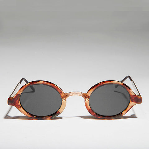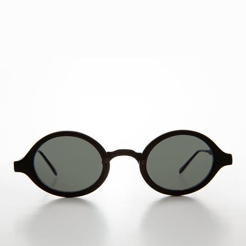 Stylish, oval sunglass with embossed metal nose bridge and temples. Saddle bridge vintage styling. Another great rare vintage find at the Sunglass Museum. Optical quality frame.