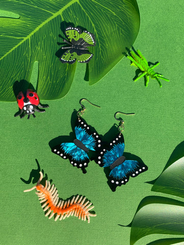 Beautiful butterflies known for their striking blue color. Made from an original design and laser-cut acrylic. Each piece is handmade, so slight differences can be expected. These are finished with hypoallergenic, anti-tarnish gold-plated earring hooks.