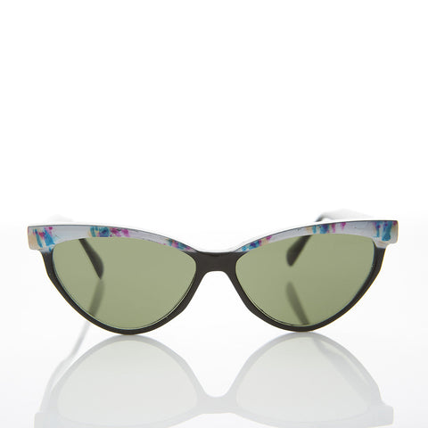 Black cat eye sunglass that features a colorful, raised, browline.  These groovy cats are a great addition to any wardrobe.  Made from acetate with triple barrel metal hinges.  Optical quality frame.