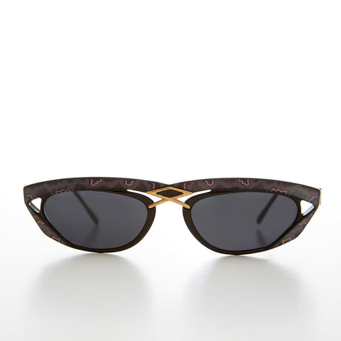 This rare stand out sunglass features a sleek and rectangular silhouette with an extra bold two-toned brow line and gold accents.