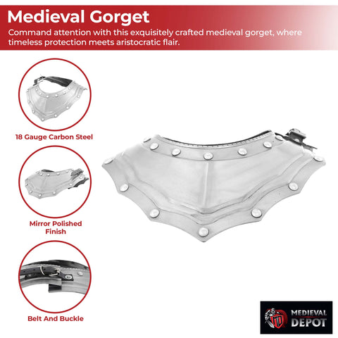 Command attention with this exquisitely crafted medieval gorget, where timeless protection meets aristocratic flair. Forged from resilient 18-gauge carbon steel, it offers authentic defense without sacrificing comfort. The mirror-like polished finish captures the light and eye, transforming practical armor into a statement piece for knights, reenactors, and collectors. Its intelligent belt-and-buckle closure ensures a precise, adjustable fit for extended wear during LARP battles, stage combat, or historical displays. Lightweight yet unwavering, this gorget seamlessly bridges the gap between battlefield readiness and collector’s showcase—elevating any armor ensemble with understated authority.
