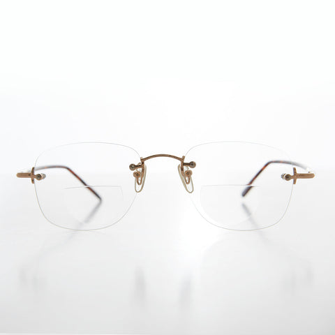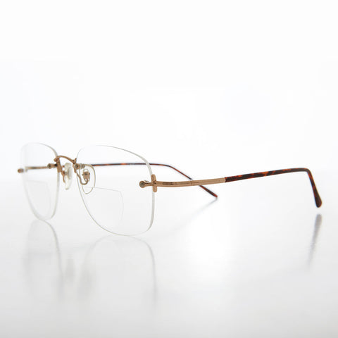 This lightweight frame features spring plastic coated tube temples and clear bifocal lenses. Bifocal lenses provide clear distance vision and lower lens magnification. New old stock. Never worn. Great condition.