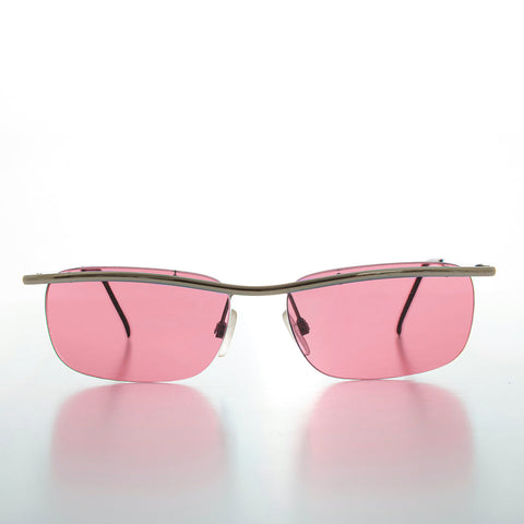 This y2k vintage sunglass features a sleek narrow rectangle rimless lens with a silver mono brow bar.