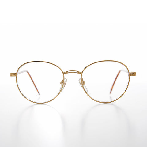 Attractive combination gold-embossed metal frame with black or tortoiseshell three-quarter plastic tube temples. New old stock 1990s. Never worn. Great condition.