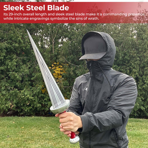 The Seven Deadly Sins Nanatsu Sword is a stunning tribute to the seven cardinal vices, combining elegance with symbolic power. Its 29 inch overall length and sleek steel blade make it a commanding presence, while intricate engravings symbolize the sins of wrath, greed, sloth, pride, lust, envy, and gluttony. The sword's large, circular metal guard, ergonomic red handle, and metal pommel bring both strength and beauty, making it perfect for collectors or anyone drawn to the depth of these mythical themes. Crafted with attention to every detail, this sword features a unique 15.5 inch blade with a sleek pattern and a hard black scabbard with gold accent fittings, ensuring it stands out in any collection. Whether displayed or wielded, it remains a powerful symbol of its heritage.