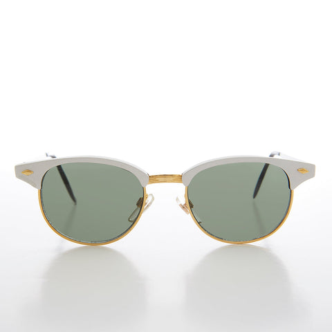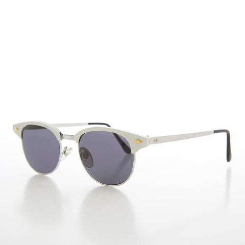 This iconic deadstock sunglass features a sleek silver half frame brow line, which looks great on most face shapes. Durable, lightweight and strong this sunglass will be a welcomed addition to your sunglass collection. New old stock. Never worn, Great condition. UV Protection.