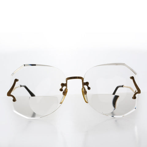 This 80s bifocal women's reader features a rimless beveled butterfly lens and gold frame. New old stock. Never worn. Great condition.