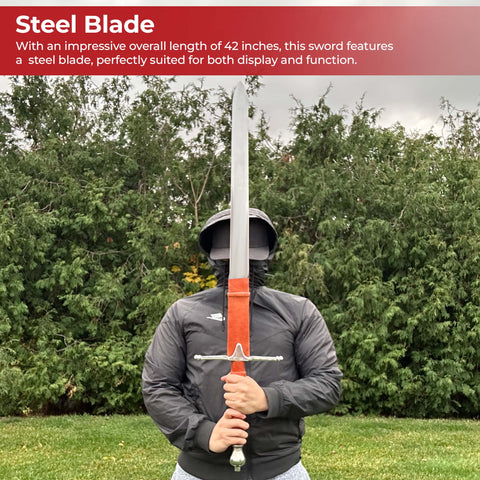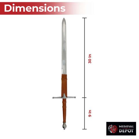 Channel the might and history of Scotland’s legendary warrior with the William Wallace Scottish Claymore sword. A formidable weapon, it combines craftsmanship and utility in one powerful design. With an impressive overall length of 42 inches, this sword features a 30 inch steel blade perfectly suited for both display and function. The first 8 inches near the guard are wrapped in genuine leather, adding a unique texture and grip. This leather wrapping provides additional stability when handling, offering an improved hold and a striking ability in close quarters. The straight metal guard enhances the sword’s balance and gives a touch of elegance to its rugged appearance, while reinforcing its practical design for use. The 9 inch ergonomic handle is also wrapped in genuine leather, providing comfort and ease of use for two-handed wielding, making it both a stunning and functional piece. Finished with a metal pommel, this claymore achieves perfect balance, improving ergonomics and making it an ideal tool for those who appreciate both beauty and utility in a weapon. Housed in a handmade brown leather sheath with a back strap, this sword is as reliable as it is captivating.