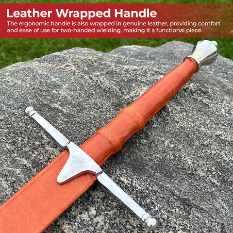 Handle: 9 inch ergonomic handle wrapped in genuine leather, designed for comfort and easy two-handed wielding